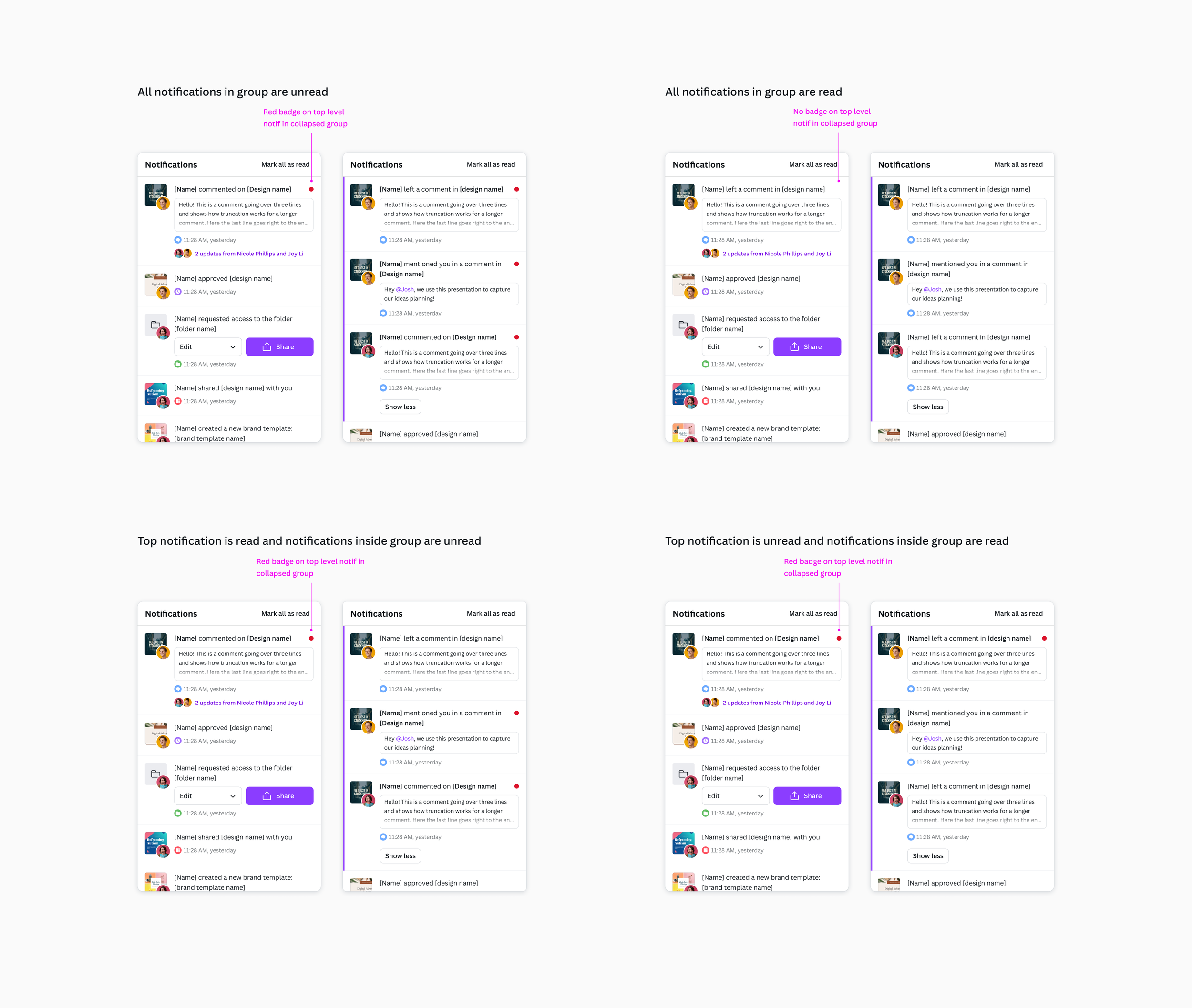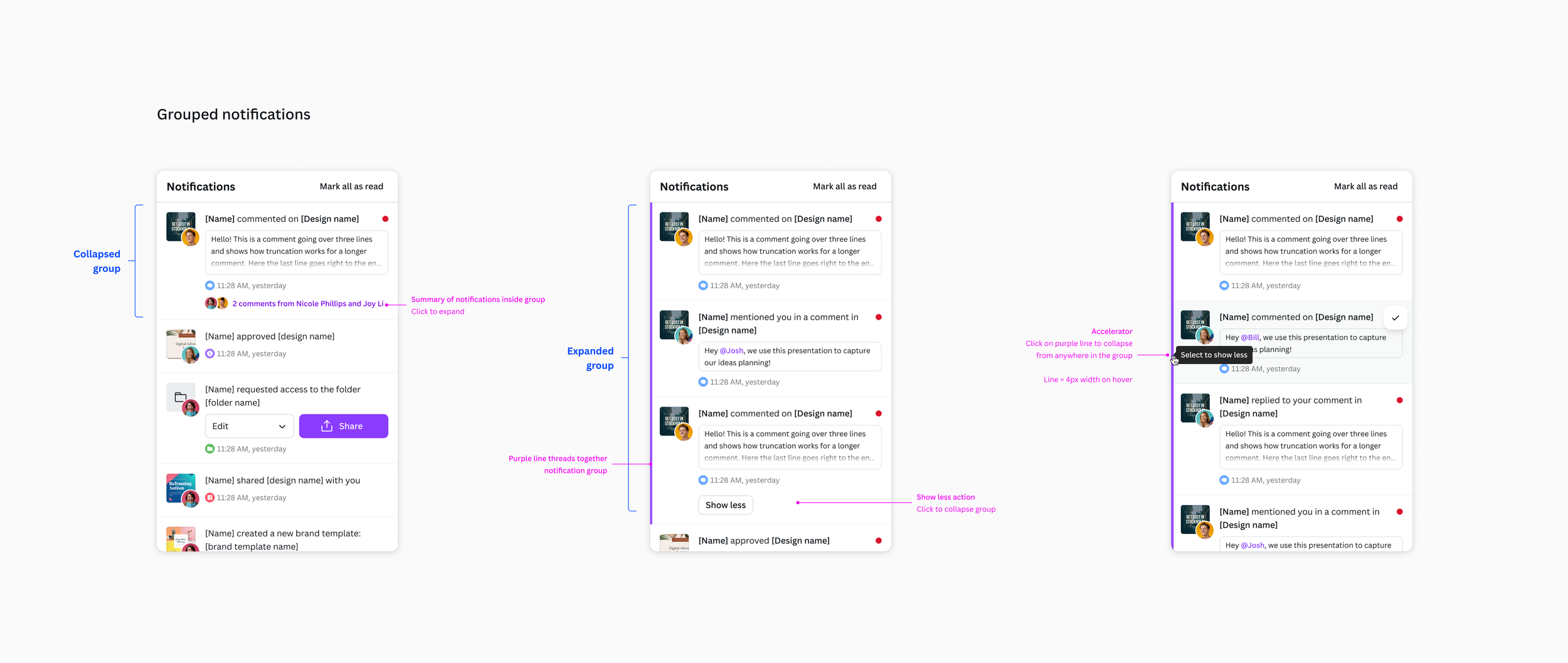 Grouping high volume notifications, such as comments and suggested edits on the same design, will reduce notification noise and improve clarity. By collapsing multiple notifications into a single thread, users can easily follow ongoing discussions without missing other important updates amidst the noise.